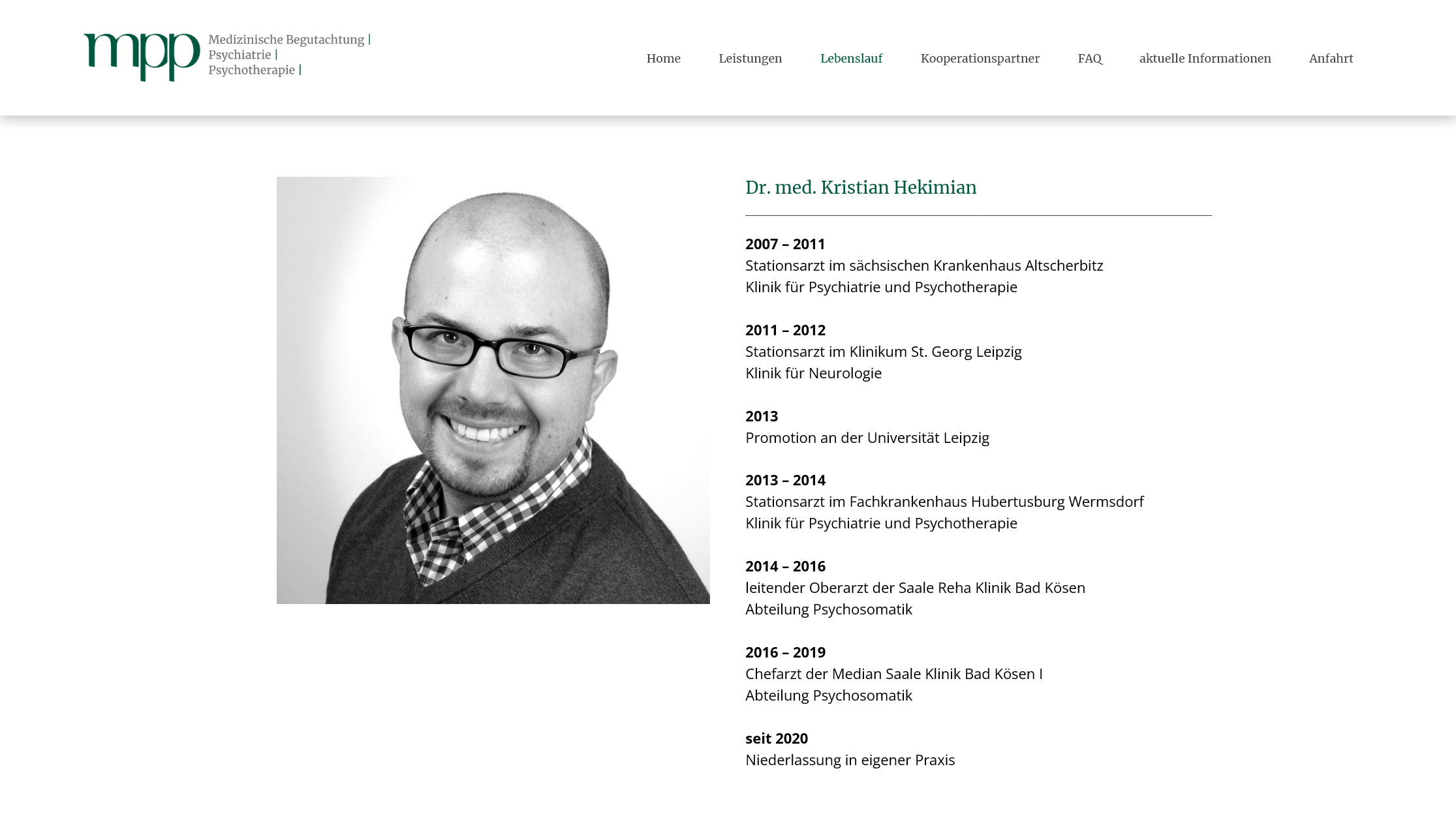Dr. med. Kristian Hekimian is a psychiatrist, psychotherapist and medical assessor. mpp is an abbreviation of Medizinische Begutachtung, Psychiatrie und Psychotherapie.